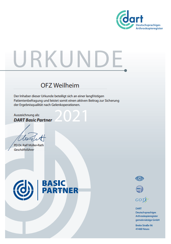 28. April 2022 von ofz-officeVor zwei Jahren haben PD Dr. Stefan Buchmann und PD Dr. Andreas Schmitt begonnen die rekonstruktiven Kniegelenkseingriffe in das Deutsche Arthroskopie Register (DART) einzutragen. Ziel ist eine langfristige und breit angelegte Messung von Behandlungsergebnissen mittels einer webbasierten, automatisierten Arzt– und Patientenbefragung. Die hierdurch gewonnenen Daten dienen der Qualitätssicherung operativer und nicht operativer Therapieformen.
